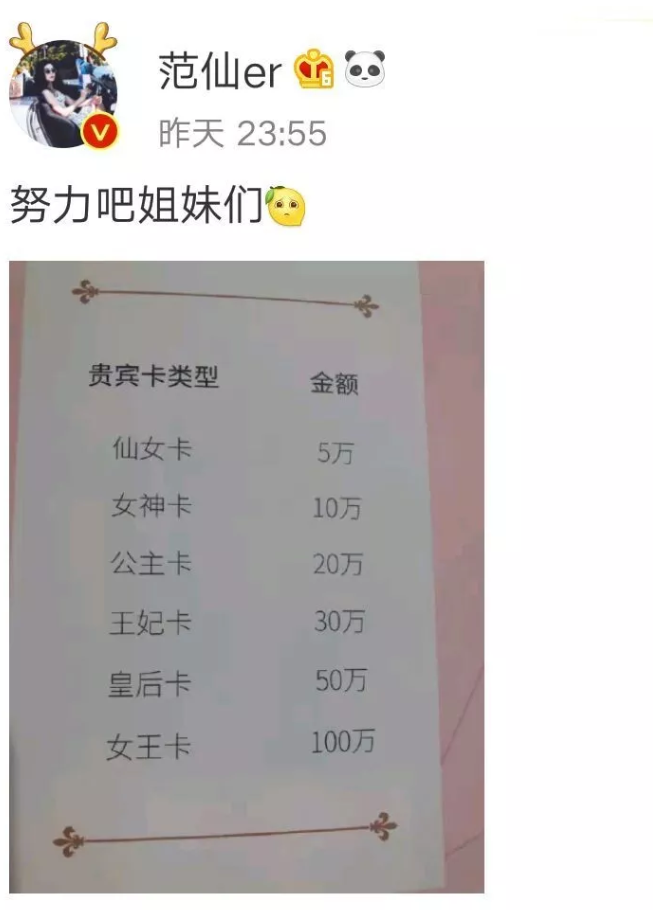 當(dāng)然,范冰冰美容院開業(yè)后,大家也關(guān)注了一個問題,那就是消費到底是什么水平。而后,就有一位微博認證為范冰冰超級粉絲的網(wǎng)友,她發(fā)博曬出了店里的貴賓卡消費標準,并喊話大家要努力。